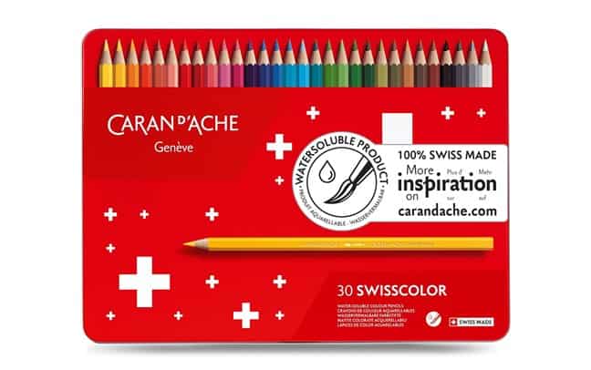 CARAN D’ACHE — CARAN D’ACHE Kredki Swisscolor Aquarelle, 30 szwajcarskich kredek akwarelowych, z możliwością malowania na sucho lub mokro, w czerwonym pudełku.