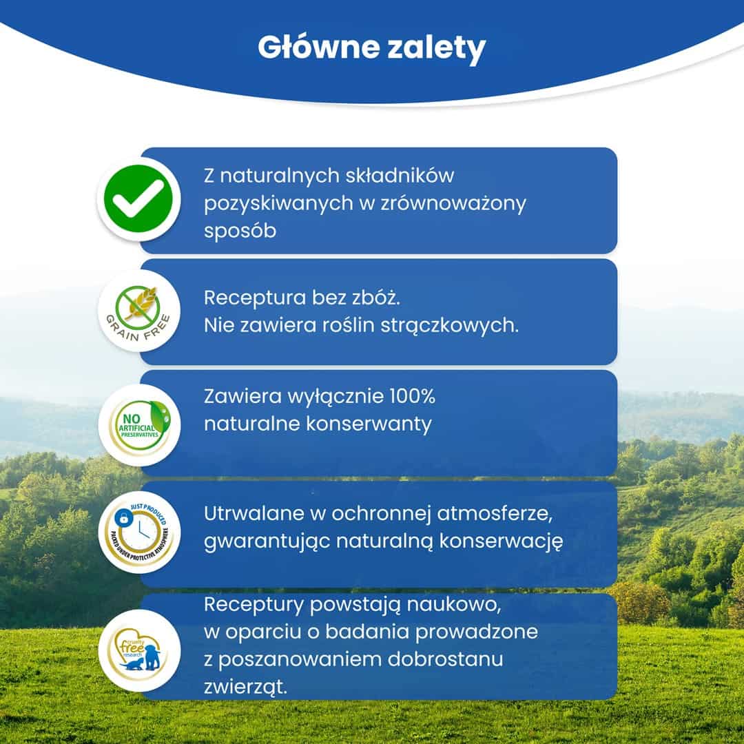 Dodatkowe cechyZdrowie ogólne, Sierść i skóra, Bezzbożowe, Bezglutenowe
