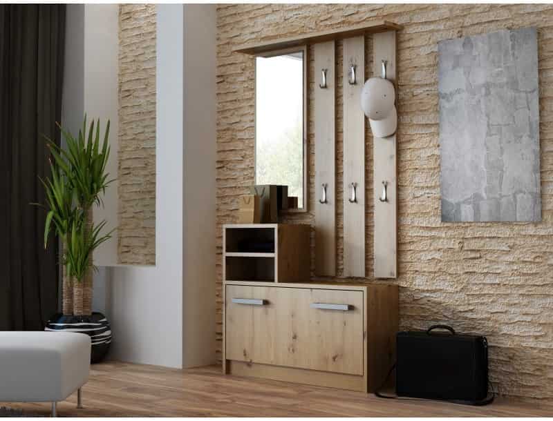 Dodatkowe informacjeMeble do samodzielnego montażu, Praktyczna szafka na buty pomieści 8-9 par obuwia, Wysokość wieszaków może być regulowana wg uznania podczas montażu, Obrzeża – wykończone tworzywem PCV (charakteryzującym się dużą wytrzymałością mechaniczną i chemiczną)