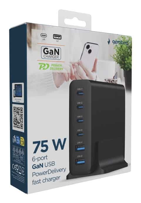GEMBIRD — GEMBIRD 6-PORTOWA SZYBKA ŁADOWARKA SIECIOWA GAN (PD) 6XUSB (2X USB-A + 4X USB-C), 75W, CZARNA