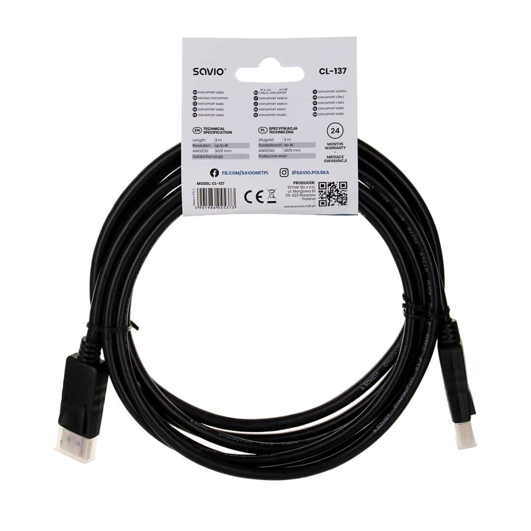 SAVIO — Kabel SAVIO CL-137 (DisplayPort M – DisplayPort M; 3m; kolor czarny)