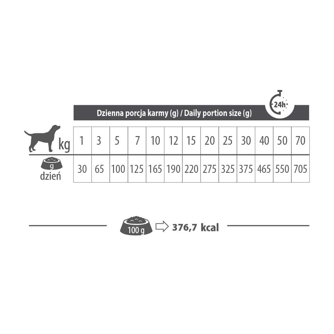 OstrzeżeniaPrzechowywać w suchym i chłodnym miejscu, z dala od bezpośredniego światła słonecznego., Zapewnić, że miska psa jest zawsze czysta, aby zapobiec zanieczyszczeniu karmy., Przestrzegać zalecanej dawki karmy zgodnie z instrukcjami na opakowaniu.