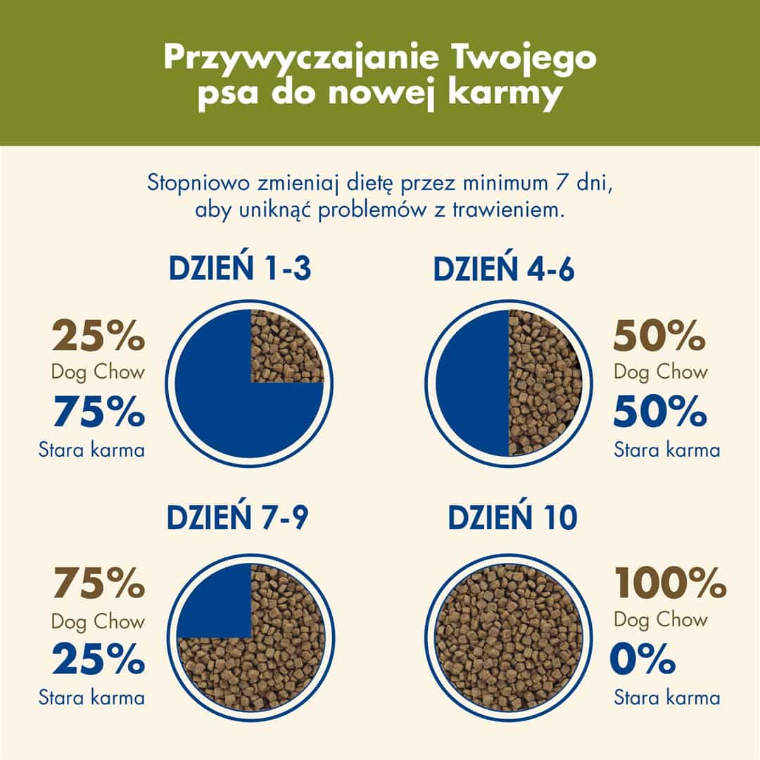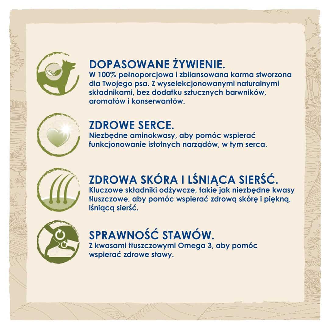 OstrzeżeniaZapewnić, że miska psa jest zawsze czysta, aby zapobiec zanieczyszczeniu karmy., Przechowywać w suchym i chłodnym miejscu, z dala od bezpośredniego światła słonecznego., Przestrzegać zalecanej dawki karmy zgodnie z instrukcjami na opakowaniu.
