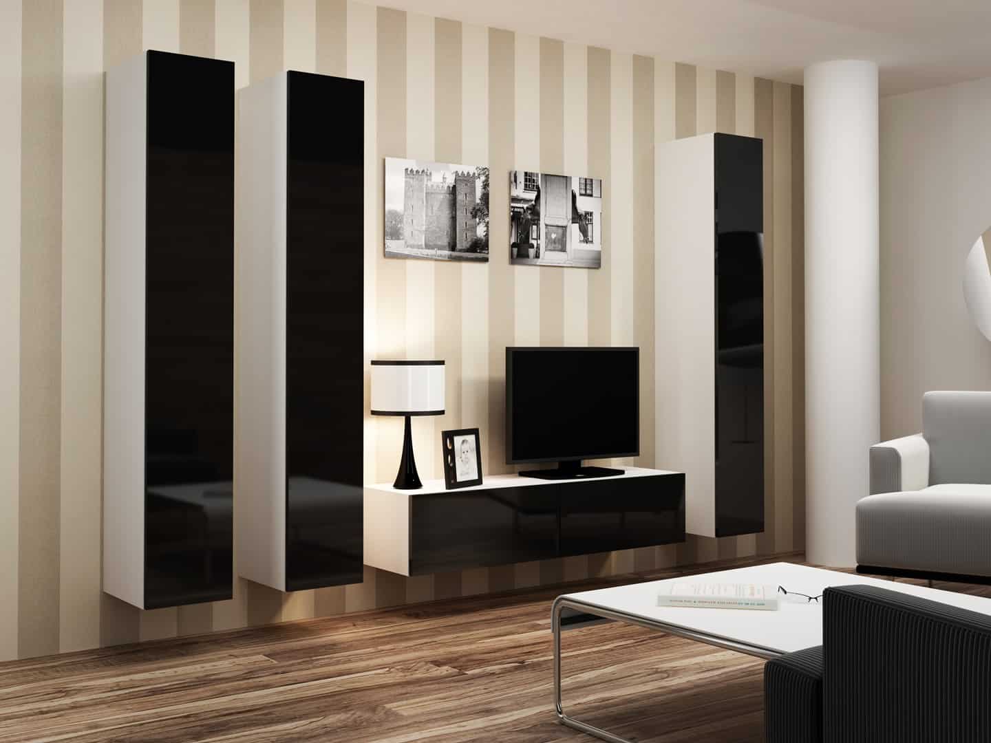 Dodatkowe informacjeZdjęcia zestawów przedstawiają przykładową aranżację z innymi meblami z kolekcji. Pozostałe bryły są dostępne w osobnej sprzedaży., Istnieje możliwość dokupienia oświetlenia szafkowego LED.