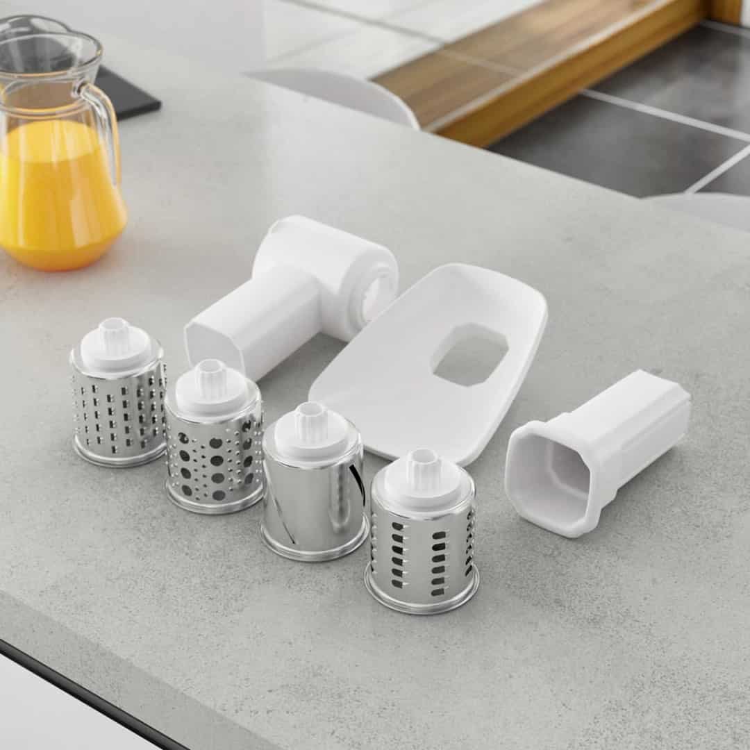 Zawartość opakowania4 nierdzewne tarki, Misa zasypowa, Komora, Popychacz x 1