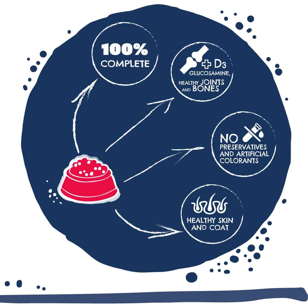 OstrzeżeniaZapewnić, że miska psa jest zawsze czysta, aby zapobiec zanieczyszczeniu karmy., Przechowywać w suchym i chłodnym miejscu, z dala od bezpośredniego światła słonecznego., Przestrzegać zalecanej dawki karmy zgodnie z instrukcjami na opakowaniu.