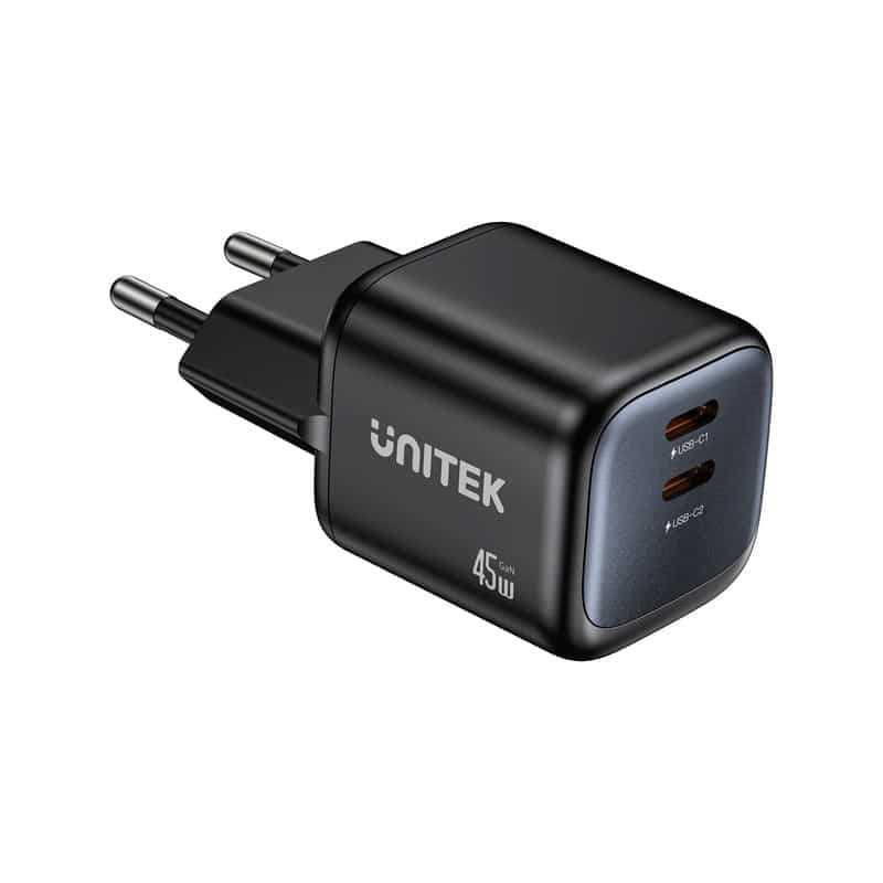 UNITEK — UNITEK ŁADOW. SIECIOWA 2X GAN 45W, 2XUSB-C PD 3.0, QC, CZARNA