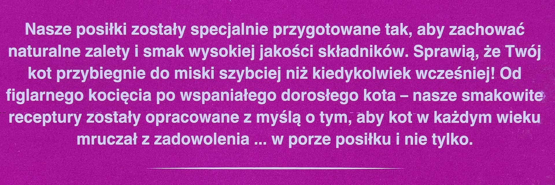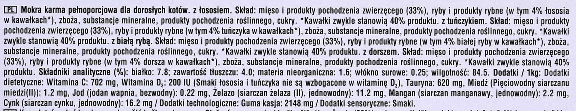 | Skład | Z ŁOSOSIEM: mięso i produkty pochodzenia zwierzęcego (33%), ryby i produkty rybne (w tym 4% łososia w kawałkach*), zboża, substancje mineralne, produkty pochodzenia roślinnego, cukry. Z TUŃCZYKIEM: mięso i produkty pochodzenia zwierzęcego (33%), ryby i produkty rybne (w tym 4% tuńczyka w kawałkach*), zboża, substancje mineralne, produkty pochodzenia roślinnego, cukry.. Z DORSZEM: mięso i produkty pochodzenia zwierzęcego (33%), ryby i produkty rybne (w tym 4% dorsza w kawałkach*), zboża, substancje mineralne, produkty pochodzenia roślinnego, cukry. Z BIAŁĄ RYBĄ: mięso i produkty pochodzenia zwierzęcego (33%), ryby i produkty rybne (w tym 4% białej ryby w kawałkach*), zboża, substancje mineralne, produkty pochodzenia roślinnego, cukry. *Kawałki zwykle stanowią 40% produktu. |