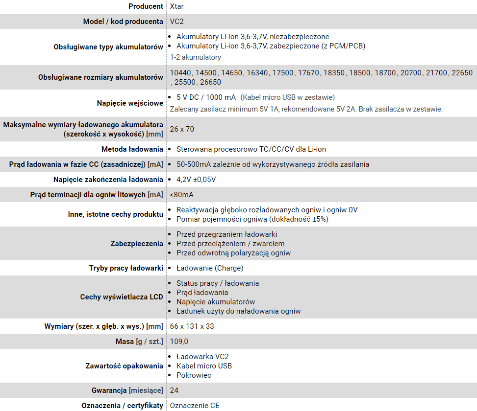 XTAR — XTAR ŁADOWARKA DO AKUMULATORÓW CYLINDRYCZNYCH LI-ION VC2