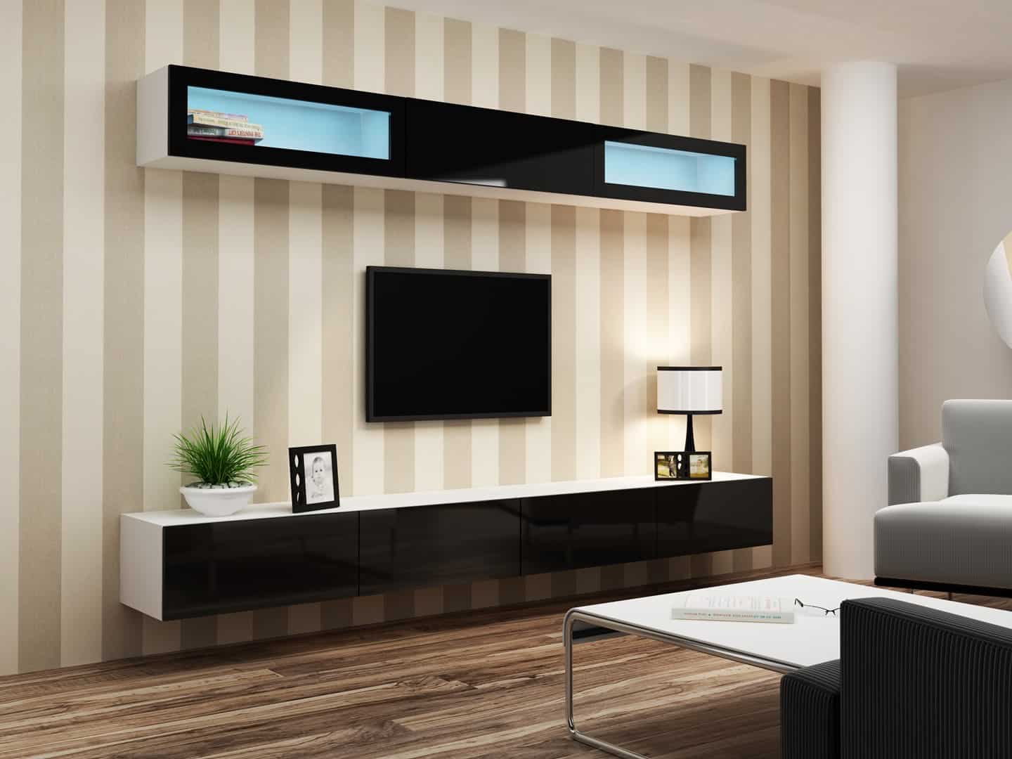Dodatkowe informacjePodany wymiar całkowity zestawu nie uwzględnia widocznych na zdjęciach przerw między bryłami. Zalecana odległość min. 10 cm., Meble do samodzielnego montażu, Płyta wiórowa laminowana wyróżnia się odpornością na naprężenia mechaniczne i ekstremalne temperatury, Istnieje możliwość dokupienia oświetlenia szafkowego LED., Szafka podwieszana, Bezuchwytowe fronty, Szafka RTV VIGO '140': 30/140/40, podwieszana, dwie klapy otwierane do dołu, wewnątrz dwie komory., Witryna VIGO '90' szkło: 35/90/32, front w wysokim połysku przeszklony, możliwość wieszania w pionie lub poziomie., Opcjonalne oświetlenie LED półek (za dopłatą), Witryna VIGO '90' pełna: 35/90/32, front w wysokim połysku, możliwość wieszania w pionie lub poziomie., Dostępne kolory podświetlenia: biały zimny, czerwony, niebieski, zielony, Zdjęcia przedstawiają przykładową aranżację zestawu.